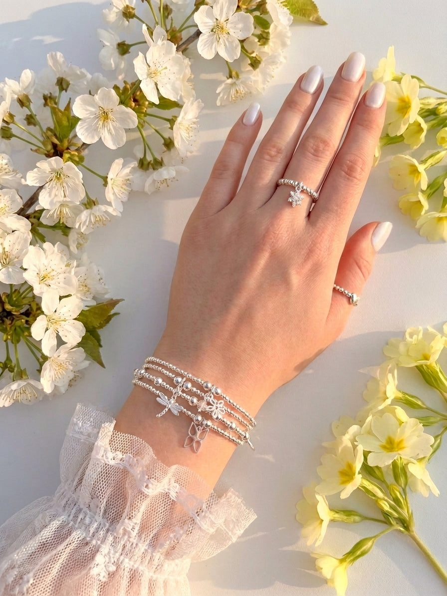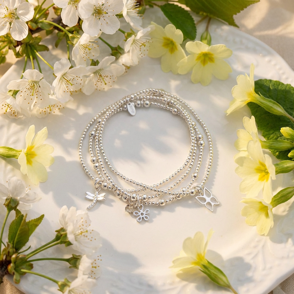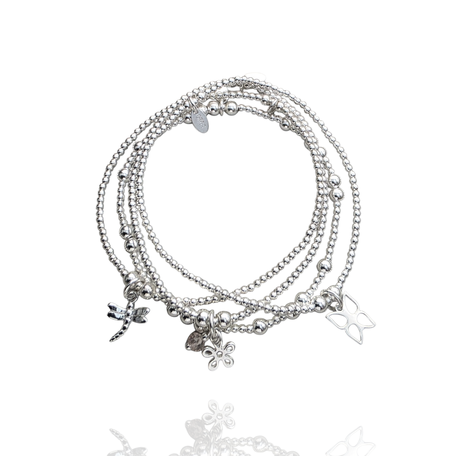 Meet the Isla Mini Bead Stack, with dreamy sterling silver mini charms and teeny tiny mini beads. This set includes four mini bead bracelets crafted from sterling silver, featuring pretty mini charms like a dragonfly, a butterfly, and a flower. Slip them on and let your wrists do the happy dance! Perfect for adding a sprinkle of whimsy to any outfit!