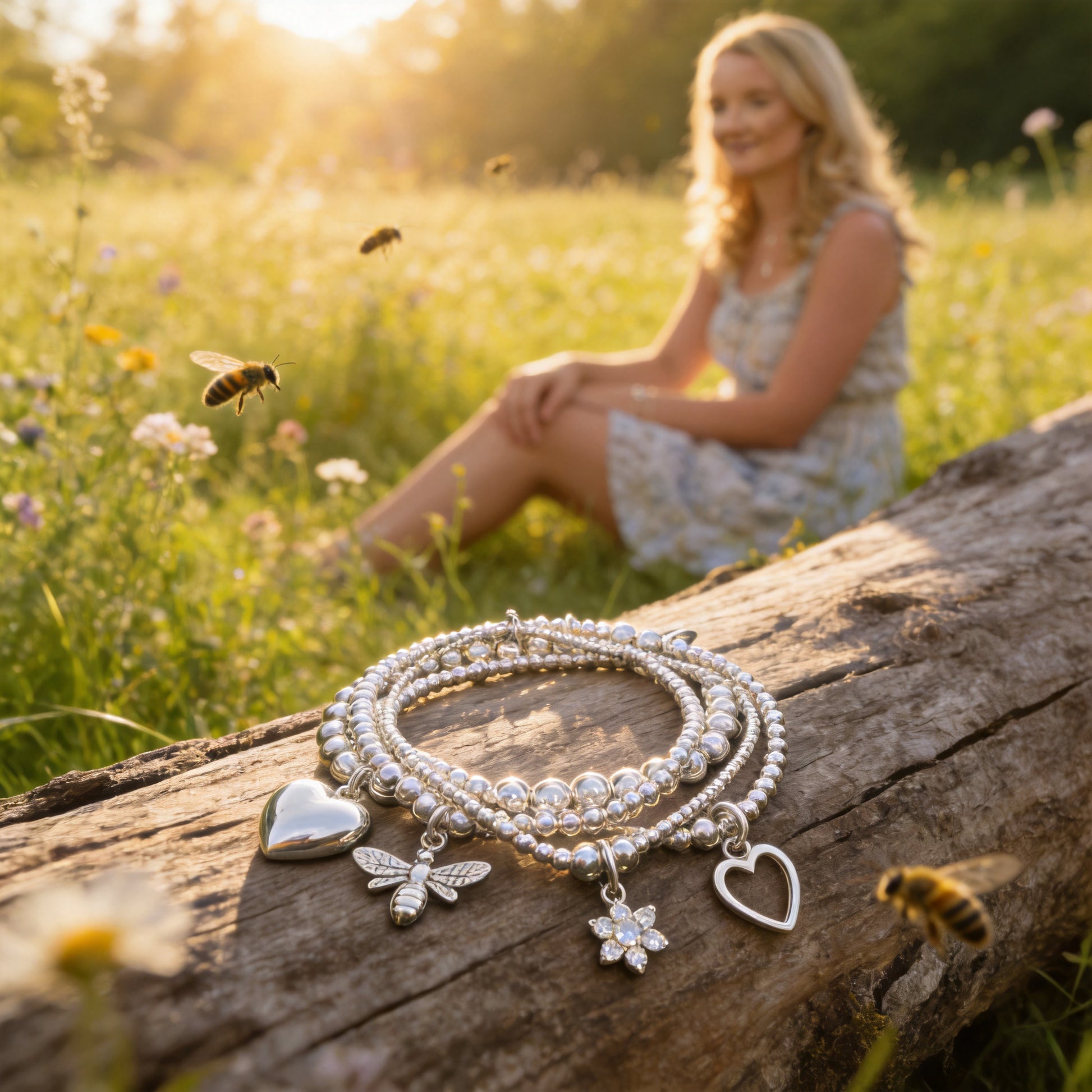 This gorgeous four-bracelet collection brings together the bold Sophia Big Heart Bracelet, the charming Silver Honey Bee Bracelet, the romantic Annabelle Open Heart Bracelet, and the dazzling Flower Sparkle Bracelet adorned with shimmering crystals that bloom with every movement.