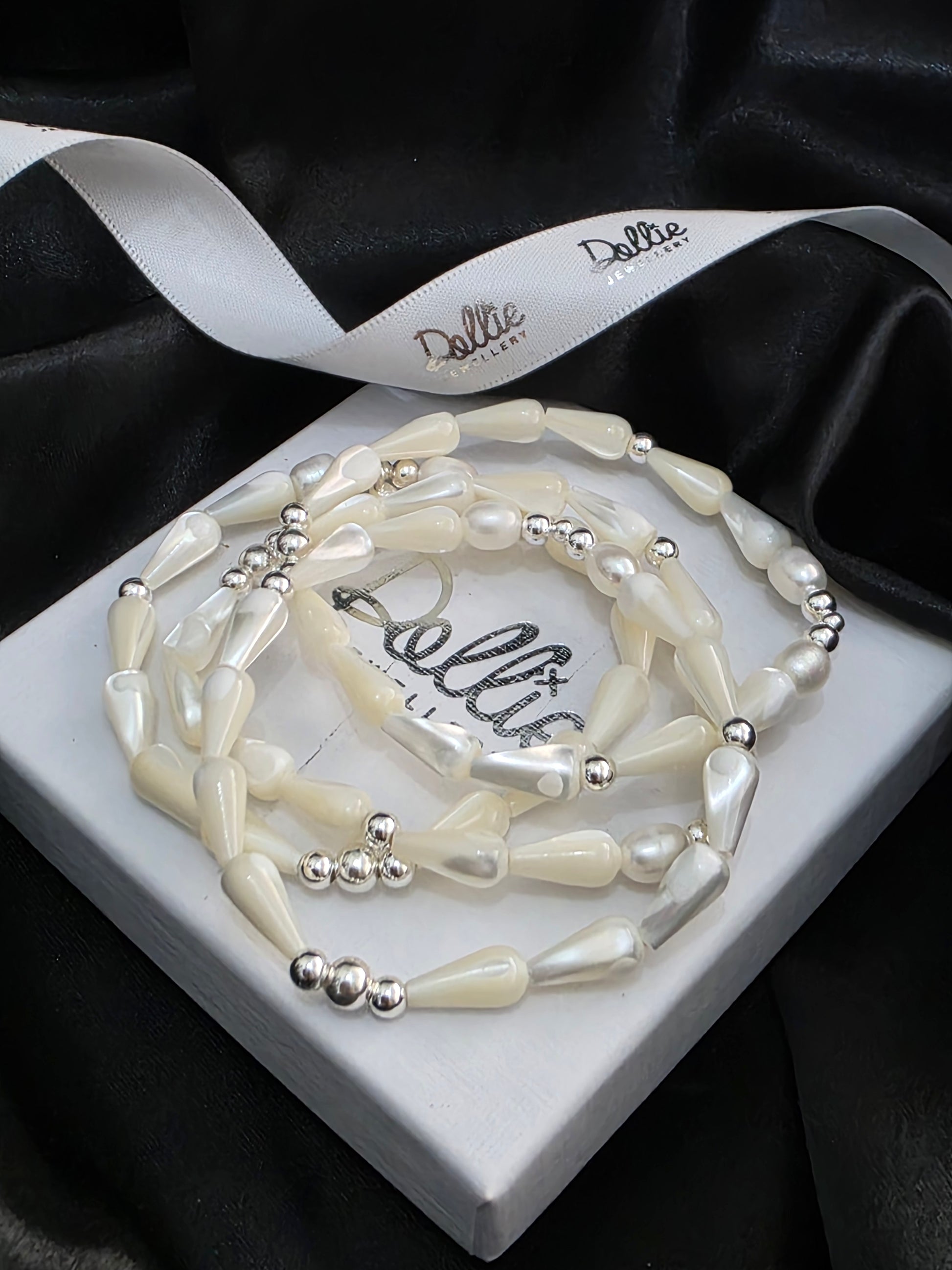 A beautiful Bracelet, completely unique to Dollie! Handmade from Sterling Silver and Mother of Pearl, create a fabulous Stack with other Dollie Bracelets. Its unique teardrop shape Mother of Pearl beads make it very popular...