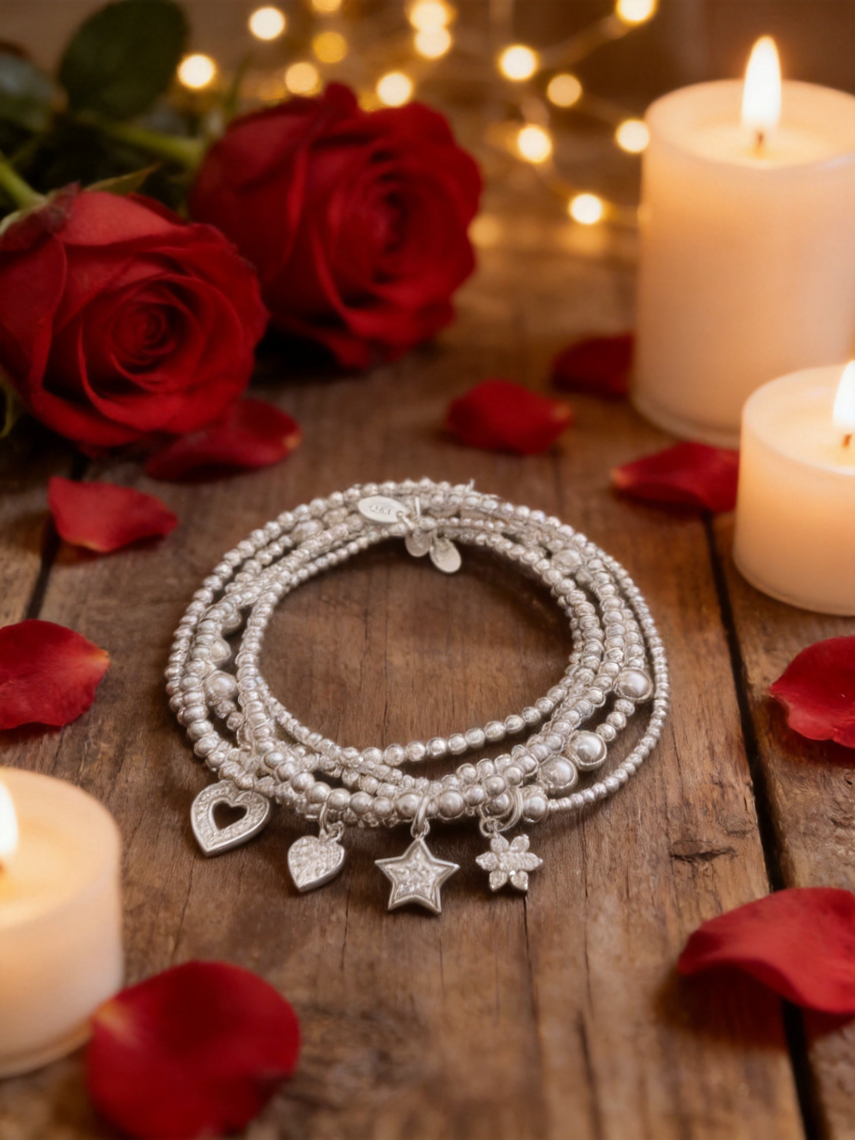 This dazzling five-bracelet stack is pure magic on your wrist, featuring the elegant Open Heart Sparkle Bracelet, the luminous White Heart Sparkle Bracelet adorned with shimmering crystals, the delicate Flower Sparkle Bracelet, the show-stopping Maxi Popcorn Bracelet, and the celestial Star Sparkle Bracelet.
