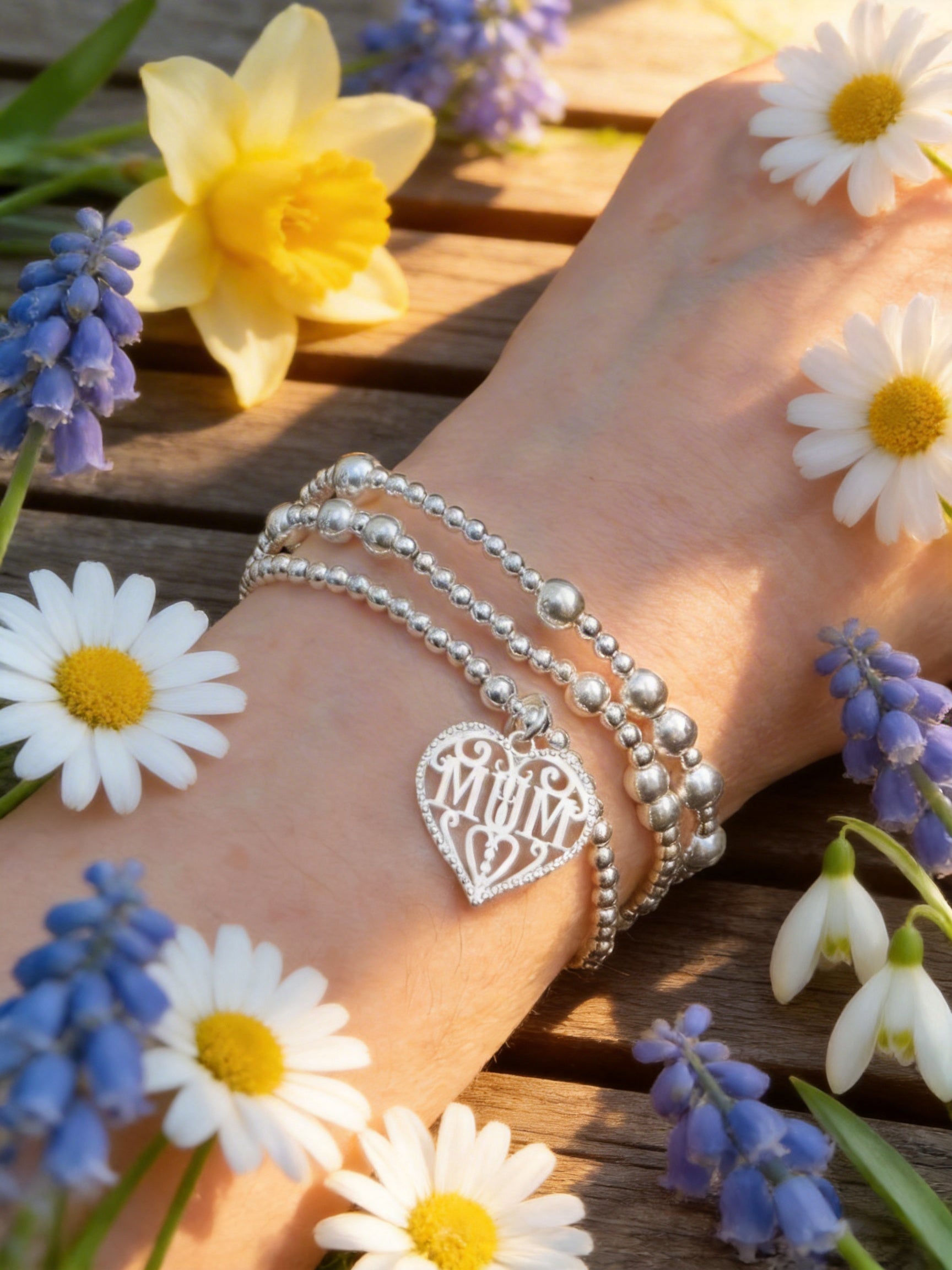 The Mother's Day Heart Bracelet features a meticulously crafted silver filigree heart, integrated with the word "mum" in its design. This bracelet combines elegance with sentimentality, making it an ideal gift for Mother's Day. The durable silver bead bracelet ensures longevity, allowing the wearer to cherish this meaningful accessory for years.