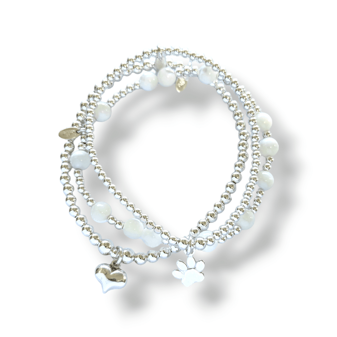 Treat your inner animal lover with this gorgeous stack of 3 bracelets. Featuring a Mother of earl, Paw Print, and a Paris Heart Bracelet, this stack makes a perfect gift for any self-proclaimed animal lover! Embrace your wild side with this fashionable accessory!